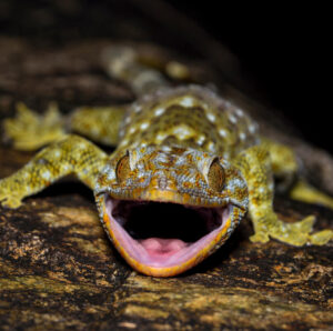 ペットとしても人気のあるヤモリです。飼育下でもうまく飼育環境を整えると、トッケイヤモリ特有の鳴き声を聞くことができます。非常に俊敏であり、人に対して攻撃性が高い個体が多いので、飼育施設の清掃・給餌の際に逃走したり、噛まれたりしないように注意して作業する必要があります。また他のヤモリ類と比べて人への警戒心も強いため、無理にハンドリングしようとすると噛まれたり、ストレスで弱ってしまう可能性があるため極力しないようにしましょう。複数頭での飼育も可能ですが、闘争などによる怪我などのリスクが高いため、なるべく単独飼育することをお勧めします。