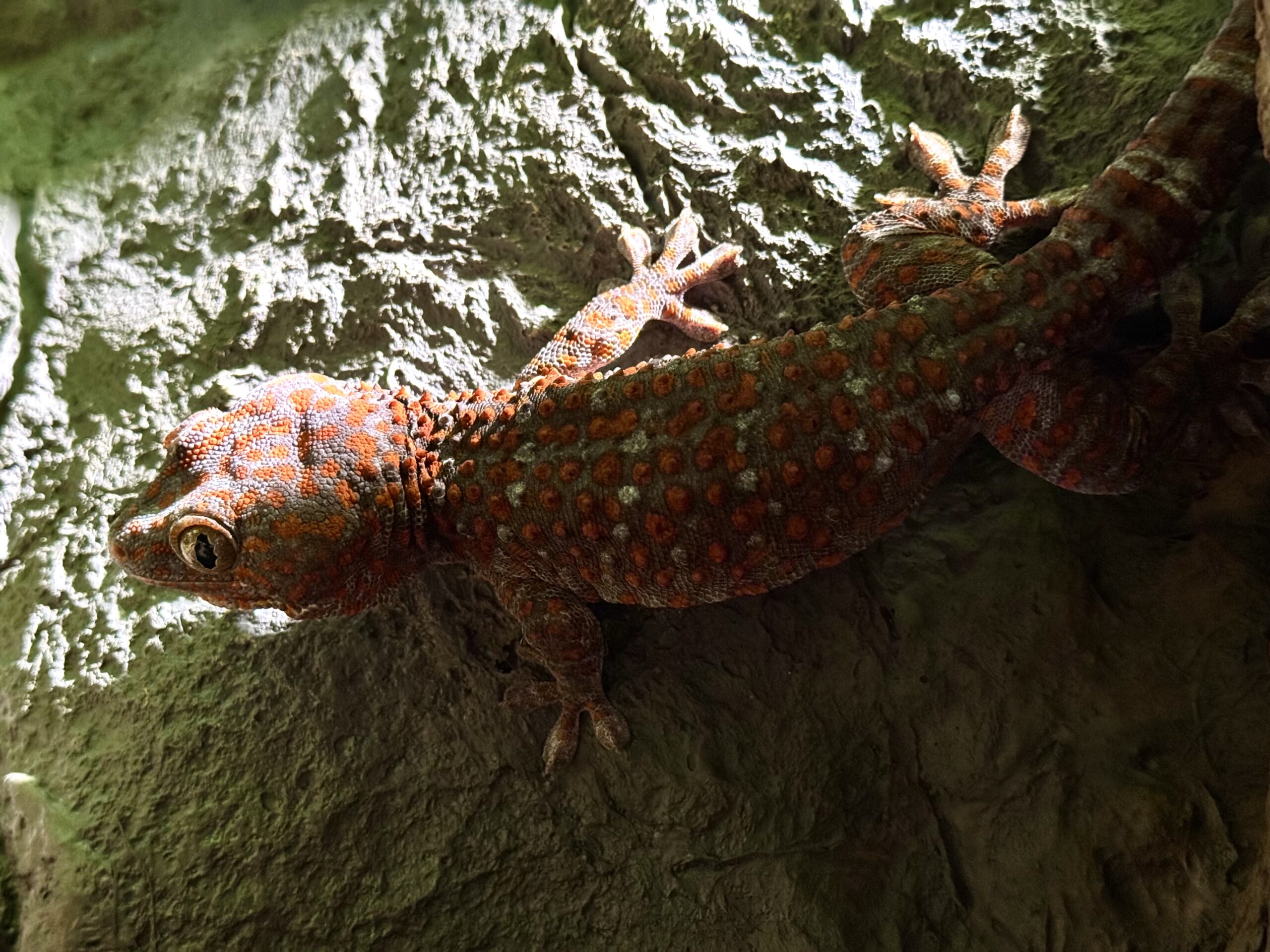 - 夜行性で、樹上や家屋で単独行動をします。メスを引き寄せるため、「トッケイ」や「ゲッコウ」と大きな声で鳴くことからその名がついています。指先に細かい毛が生えているため、垂直の壁を素早く登ることができます。皮膚は通常灰色に茶色から赤色の斑点を持ちますが、周囲に溶け込み、他の動物から目立たなくさせるために体色を明るくしたり暗くしたりすることができます。身を守るために尻尾を自切することがあります。