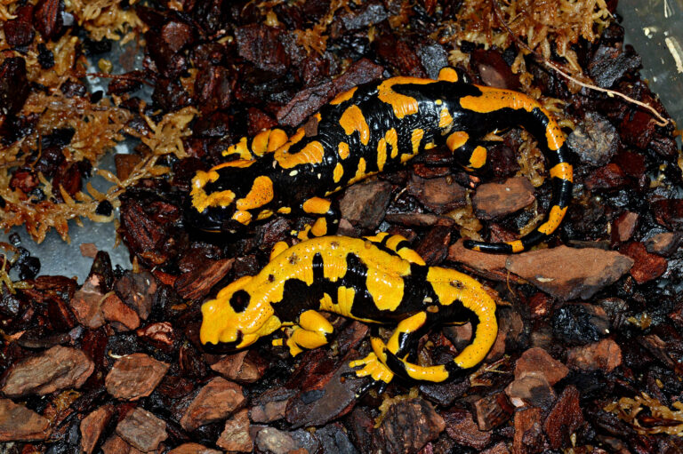 黒地に黄色の斑紋を持つものが多いですが、亜種により斑紋の形は様々です。欧米からの繁殖個体が多く流通しています。「ファイア」とは「発射」を意味し、危険を感じると相手の眼をめがけて刺激性の毒液を噴出する行動をとります。実際に飼育下でこの行動に遭遇したことはありませんが、触らない方が無難かと思われます。また、皮膚毒もあるので、触ってしまったら流水で洗い流しましょう。陸生種であまり水に入ることはないため、適度な湿度を保てる床材を敷き、シェルターと浅い水場を設置します。餌はコオロギ、ハニーワームなどを与えます。極端な低温、高温には弱いので空調の効く部屋など温度管理のできる場所で飼育しましょう。
